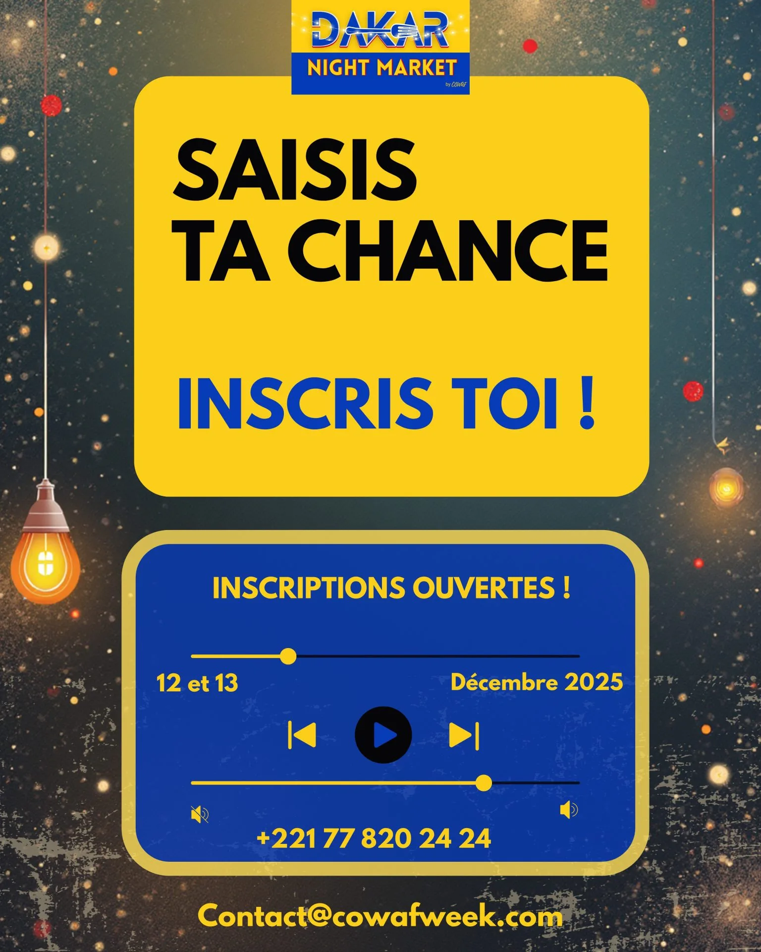 Restez connectés à nos pages Facebook et Instagram — Dakar Night Market COWAF — pour ne manquer aucune annonce et suivre toutes les étapes d’inscription.